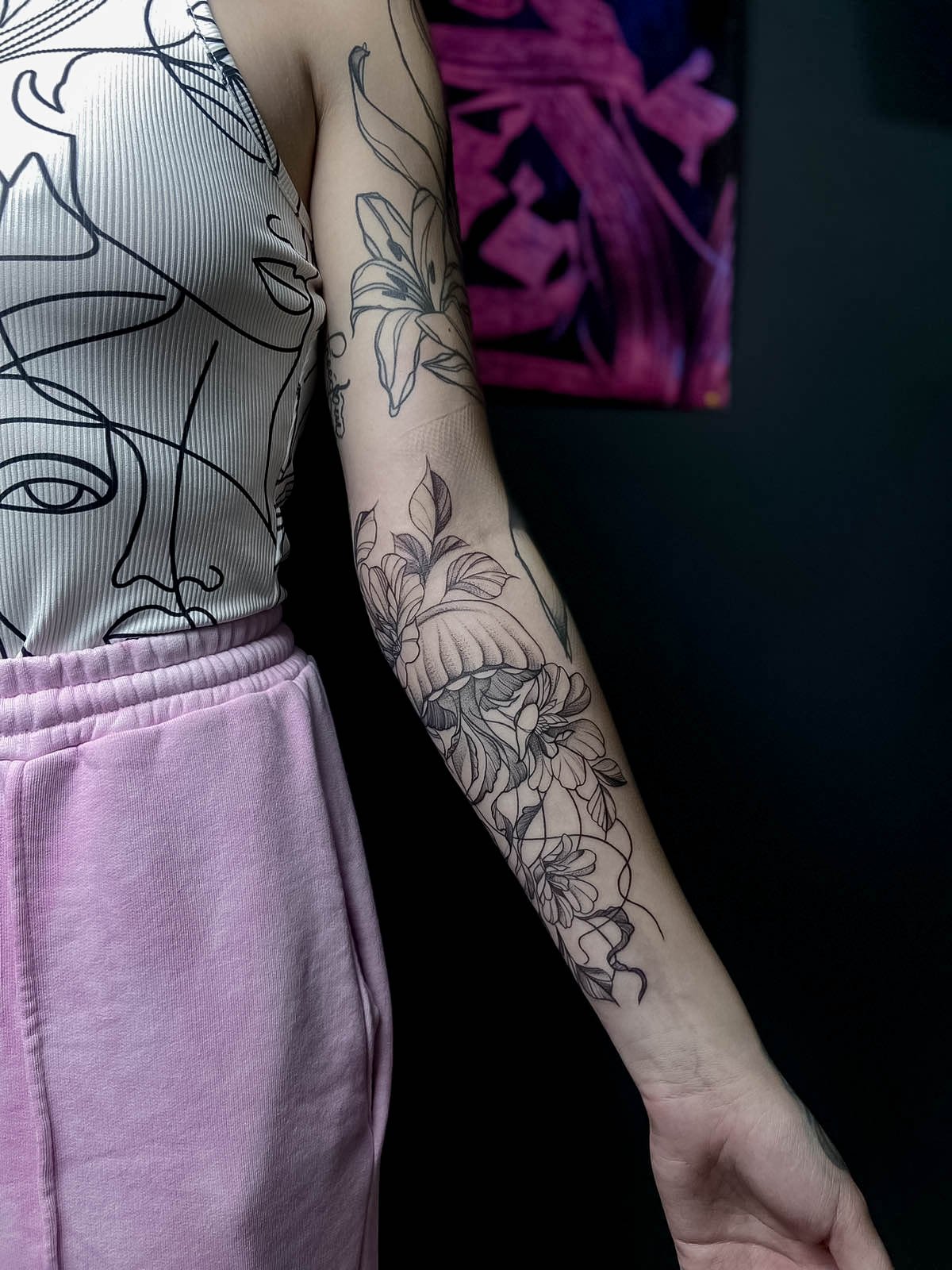 - Leichte Wahrnehmung: Feine Linien überladen das Bild nicht, wodurch das Tattoo sich organisch in jeden Stil einfügt, sei es casual oder smart casual.