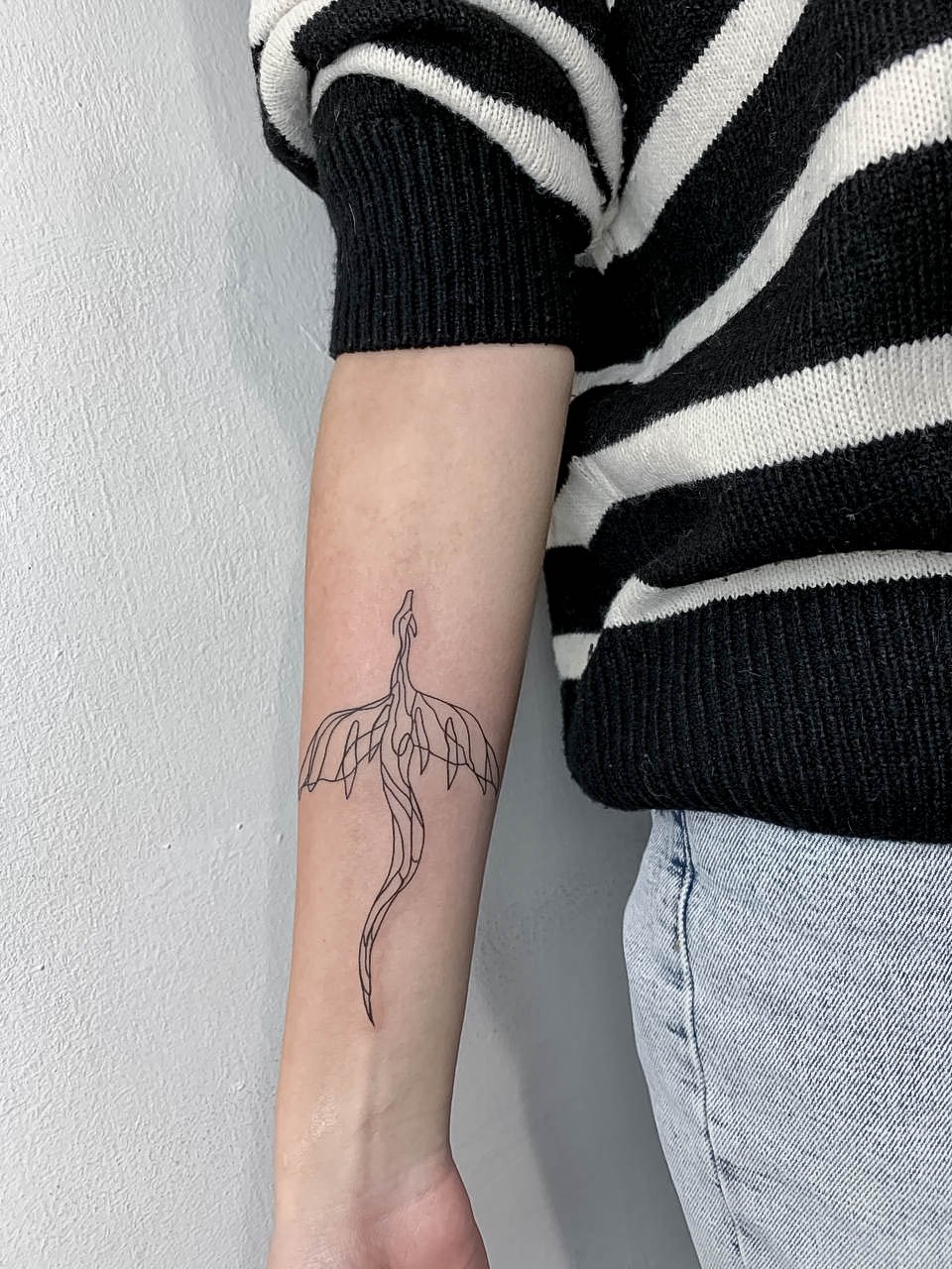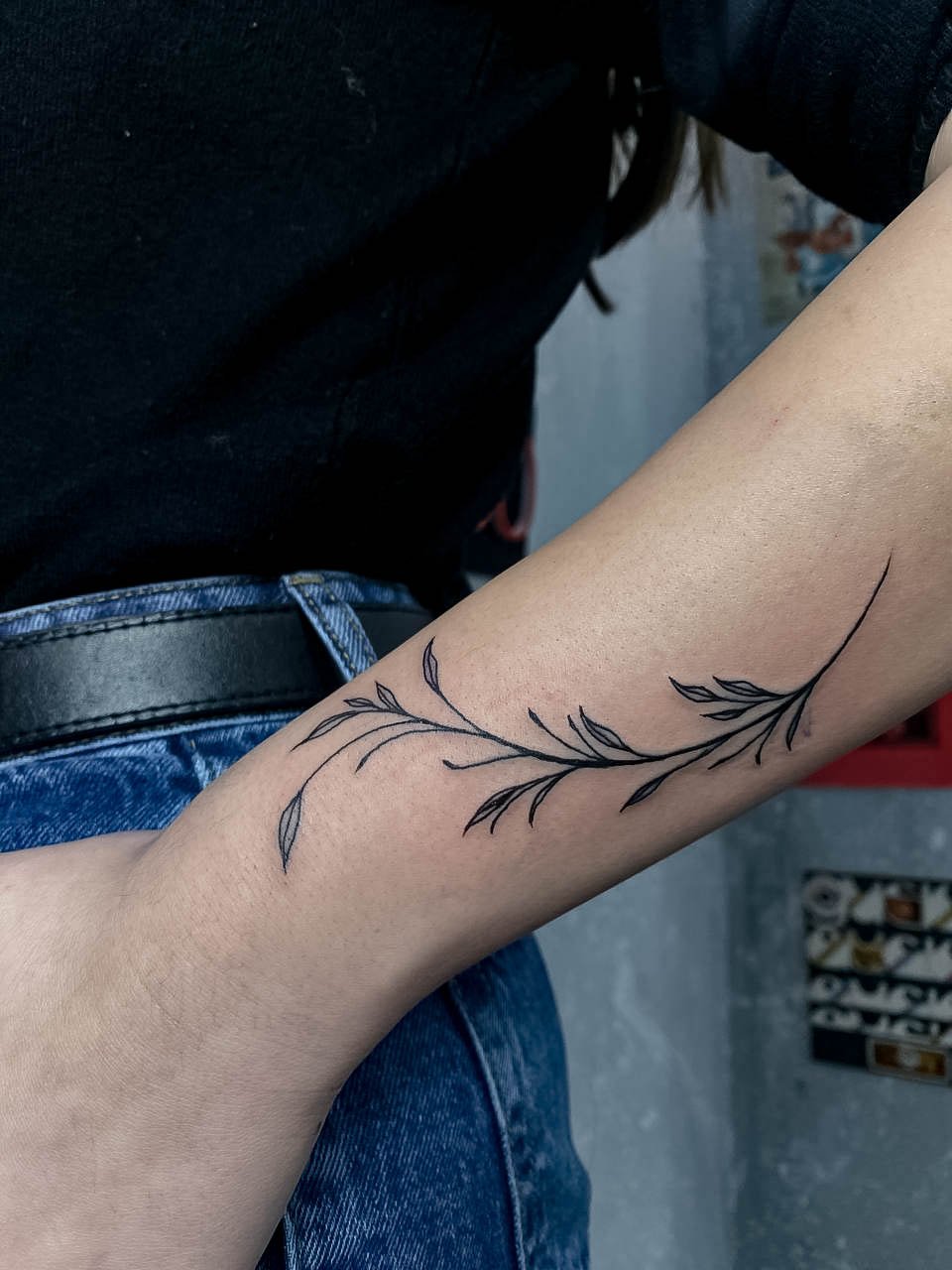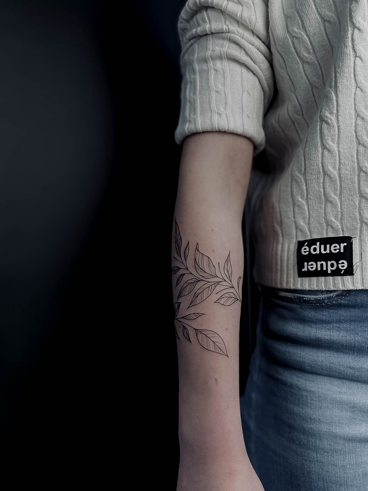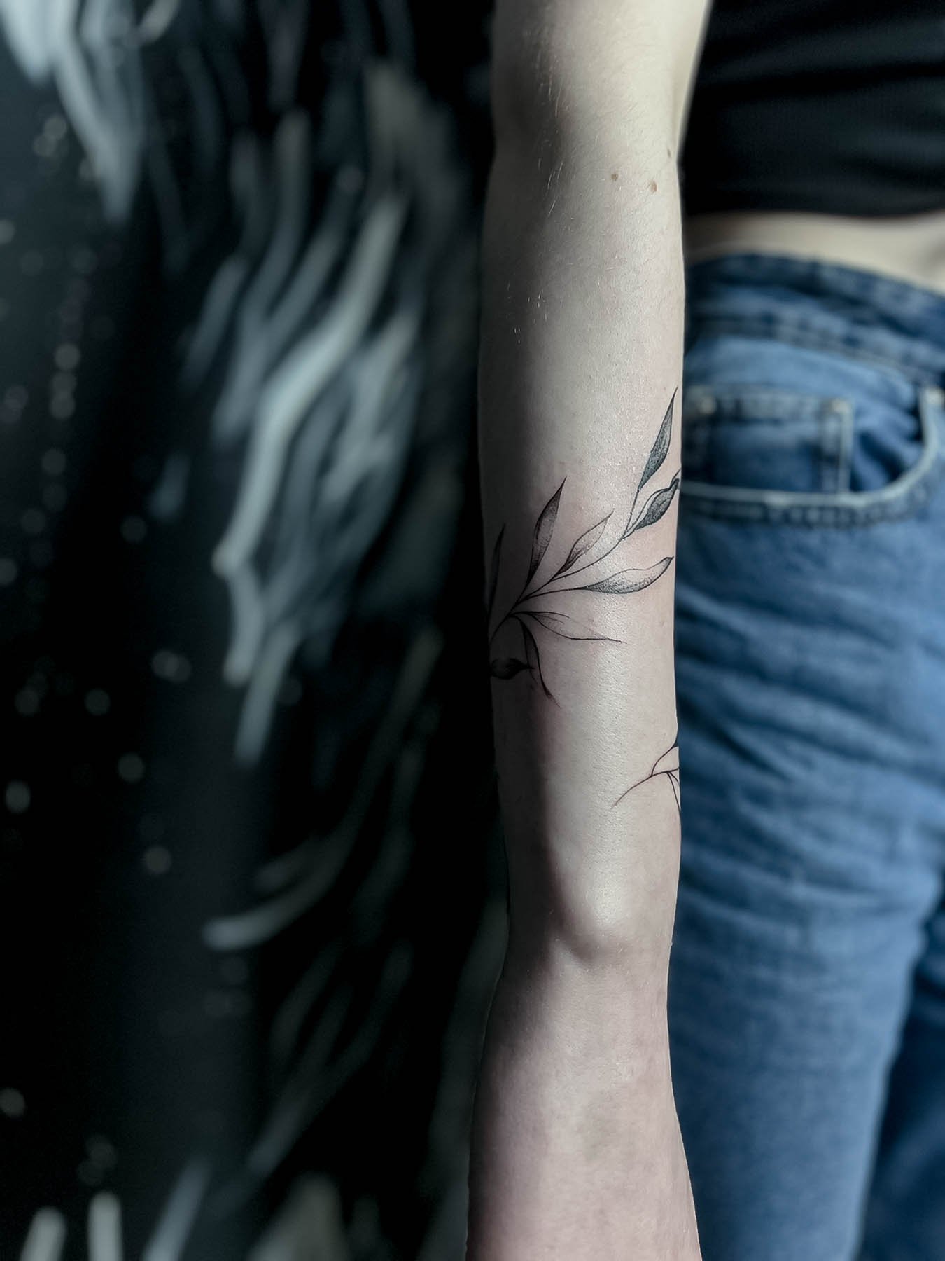 - Naturmotive: Linien können sich in feine Zweige, Blätter oder Silhouetten von Tieren verwandeln. Solche Tattoos sehen besonders zart aus und symbolisieren die Verbundenheit mit der Natur.
