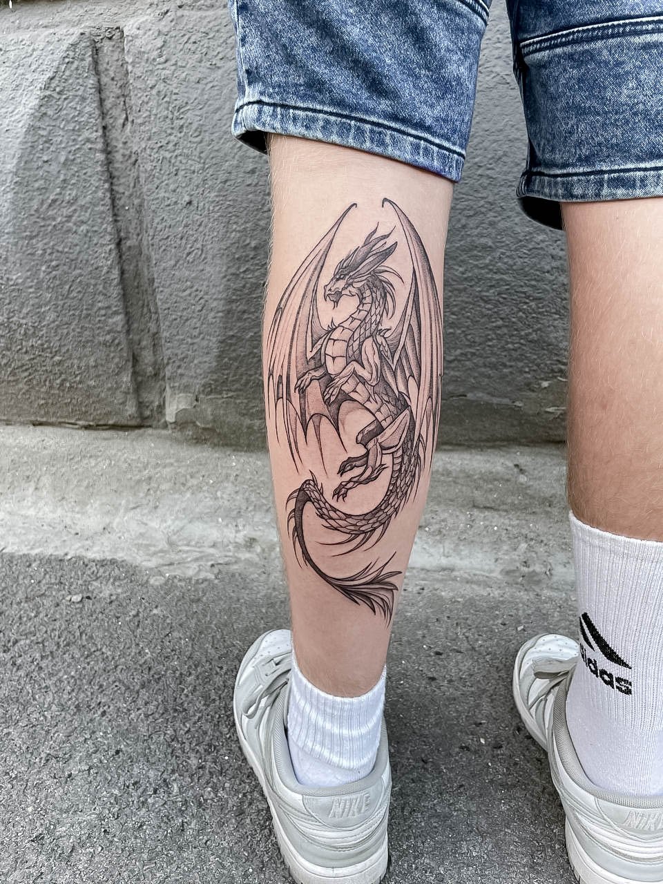 - Mythologie und Legenden: Darstellungen von Göttern, Helden oder mythologischen Wesen. Tattoos, inspiriert von Mythen und Legenden, verleihen dem Bild Tiefe und Symbolik. Zum Beispiel Zeus mit einem Blitz in der Hand oder ein Drache, der das Bein umschlingt – kraftvolle und charismatische Bilder, die Stärke und Weisheit ihres Trägers unterstreichen.