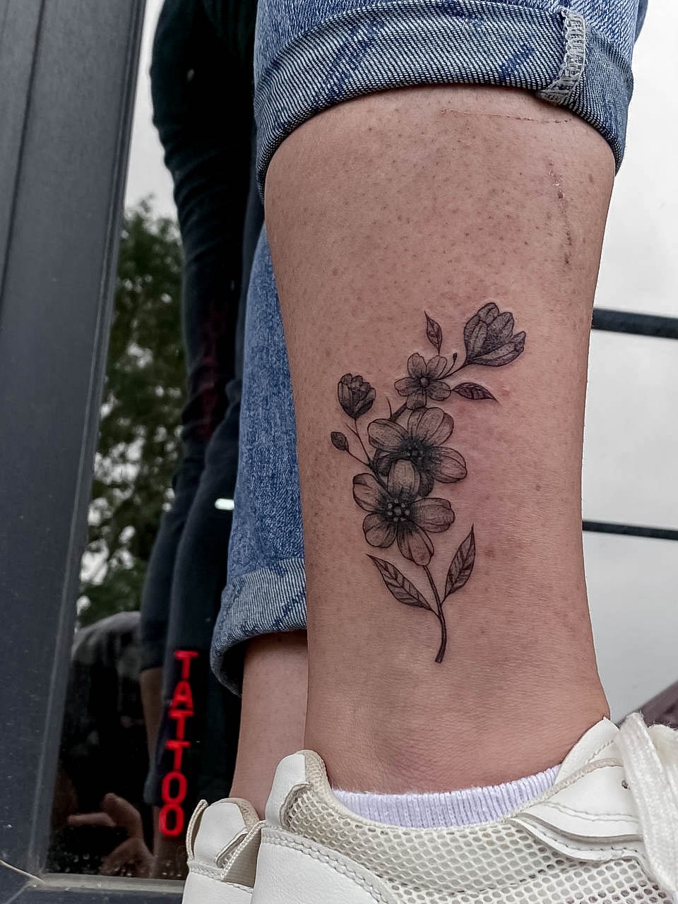 - Blumenmuster: Eines der beliebtesten Motive für Frauen. Lavendel, Rosen, Lilien oder Kirschblüten – diese Blumen symbolisieren Weiblichkeit, Schönheit und Zartheit. Blumen-Tattoos können das ganze Bein bedecken und dessen Anmut unterstreichen oder sich auf dem Knöchel oder Fuß befinden, um einen eleganten Akzent zu setzen.