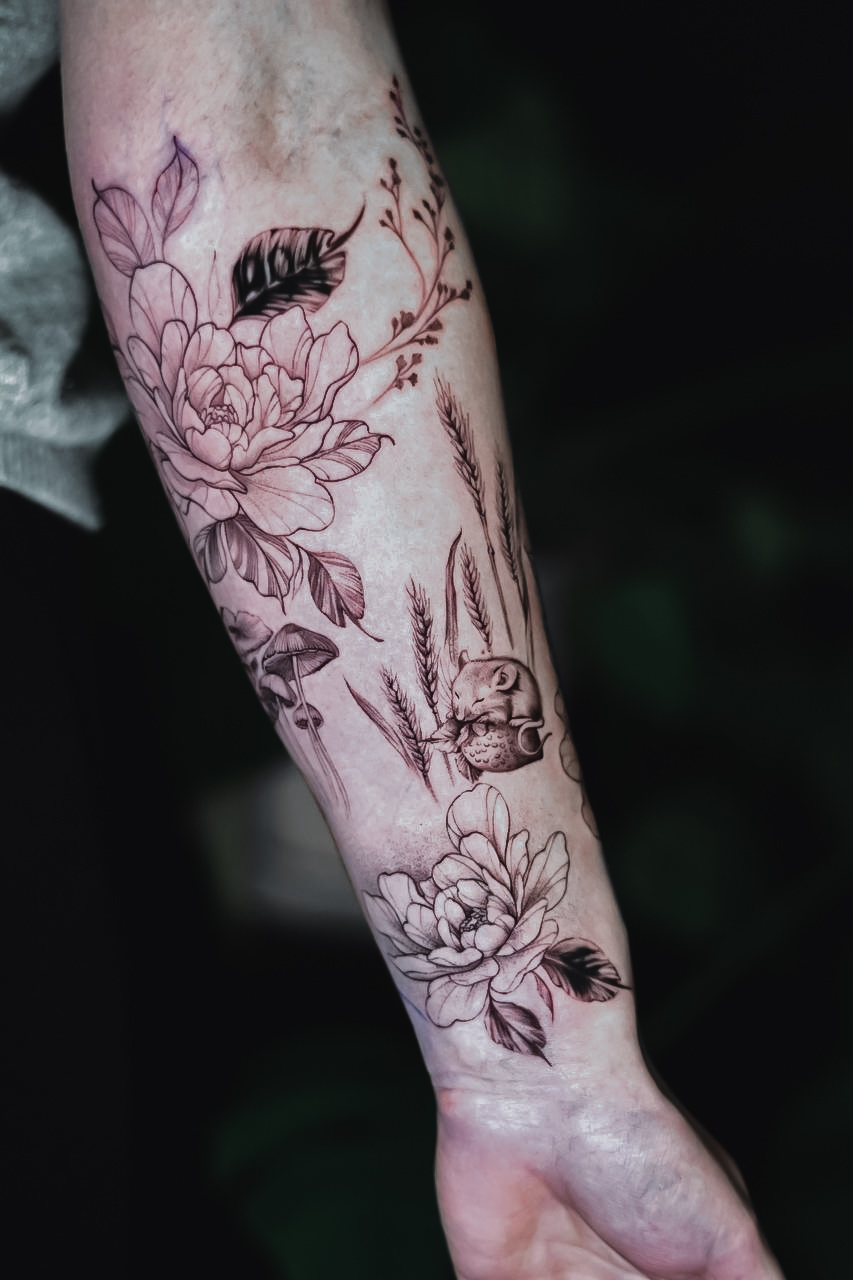 #Tattoo auf dem Arm #Blumen #Mikro-Realismus #Pfingstrosen #Tätowierung
